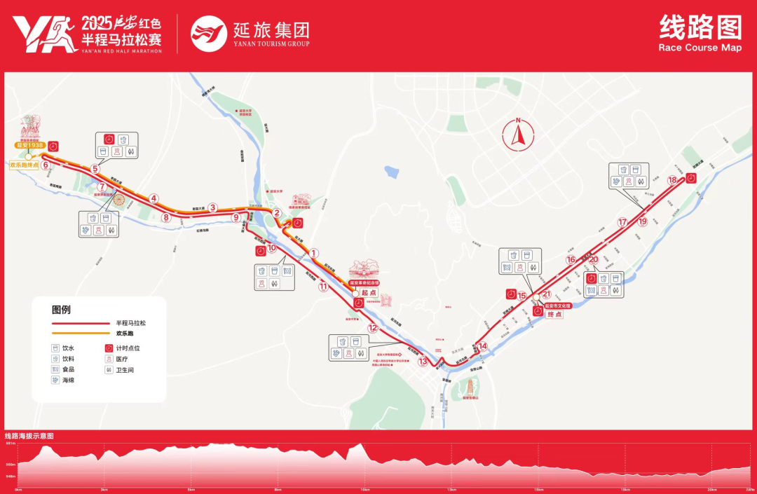 欢乐跑路线:延安革命纪念馆(延河东路)→延河东路(全幅)→延大路(全幅)(右转)→杨家岭路(顺行)→杨家岭路福州希望小学折返处(折返)→杨家岭路(顺行)(右转)→延大路(全幅)→兰家坪大桥(顺行)→枣园大道(顺行)→终点:延安1938街区广场(枣园大道)。