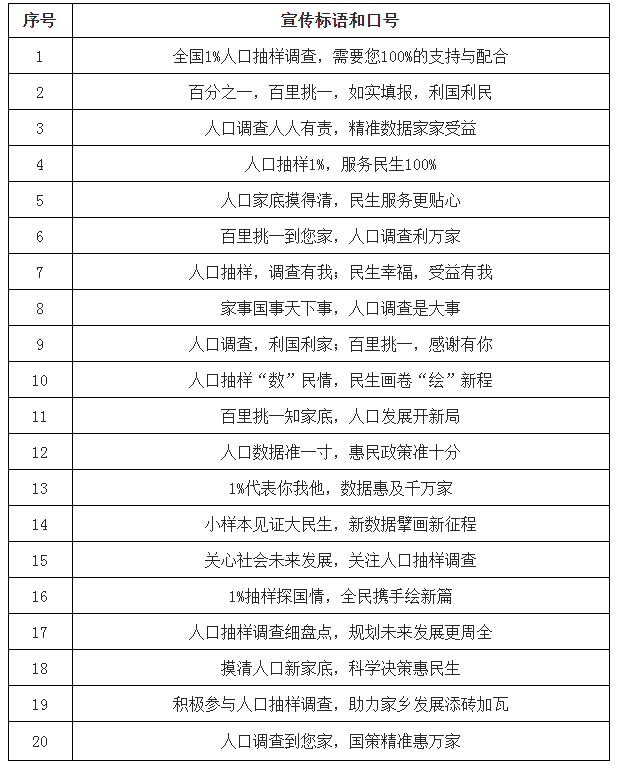 为加强2025年全国1%人口抽样调查宣传工作,动员社会各界支持配合1%人口抽样调查,2025年全国1%人口抽样调查协调小组办公室于5月6日至16日开展了全国1%人口抽样调查宣传标语和口号征集活动。此次活动得到社会各界的广泛关注和积极参与,共收到投稿7400余条。经认真筛选、评审,最终选出20条优秀作品,将用于2025年全国1%人口抽样调查宣传活动。现将评选结果通告如下:
