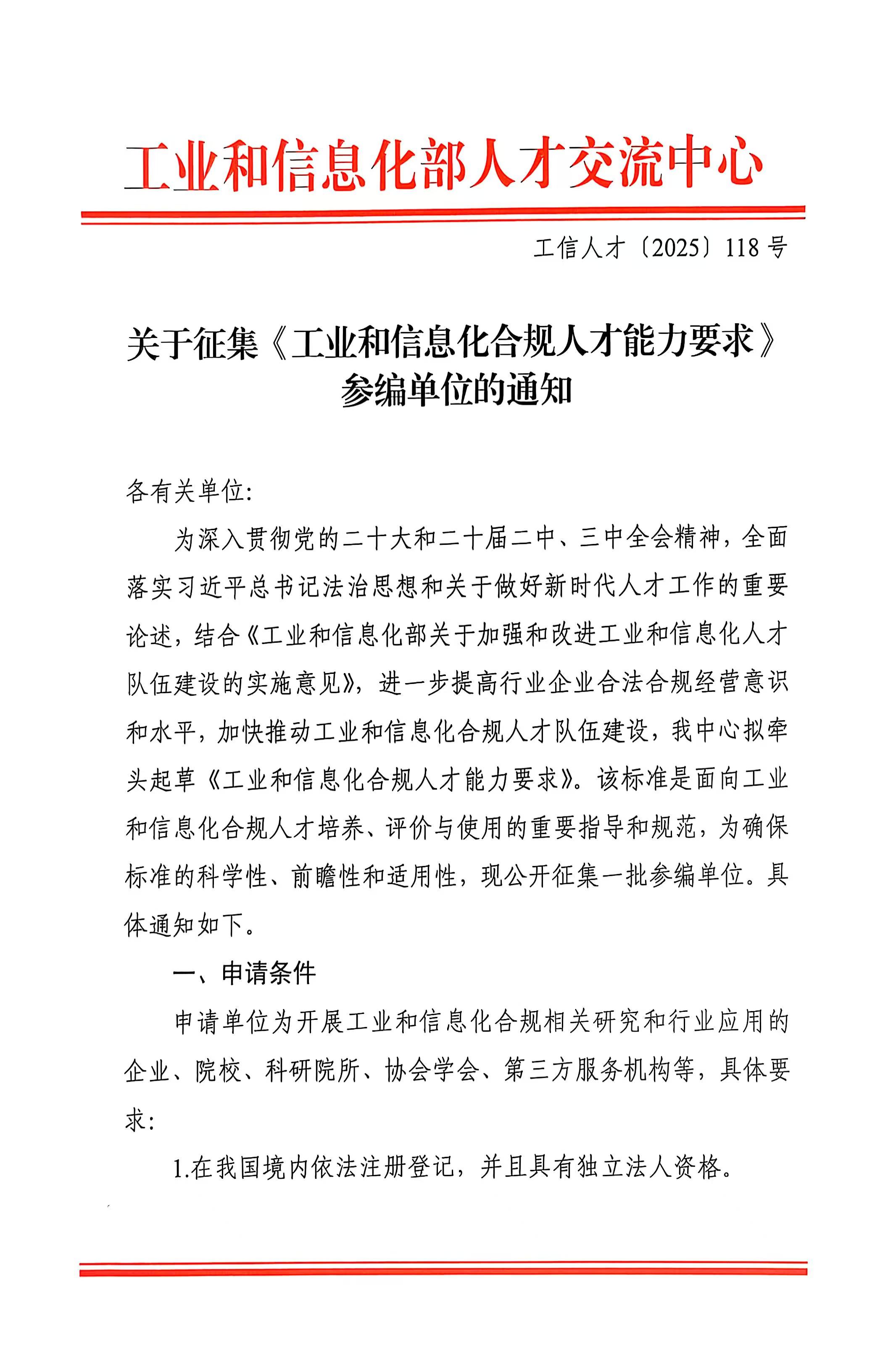 关于征集《工业和信息化合规人才能力要求》参编单位的通知