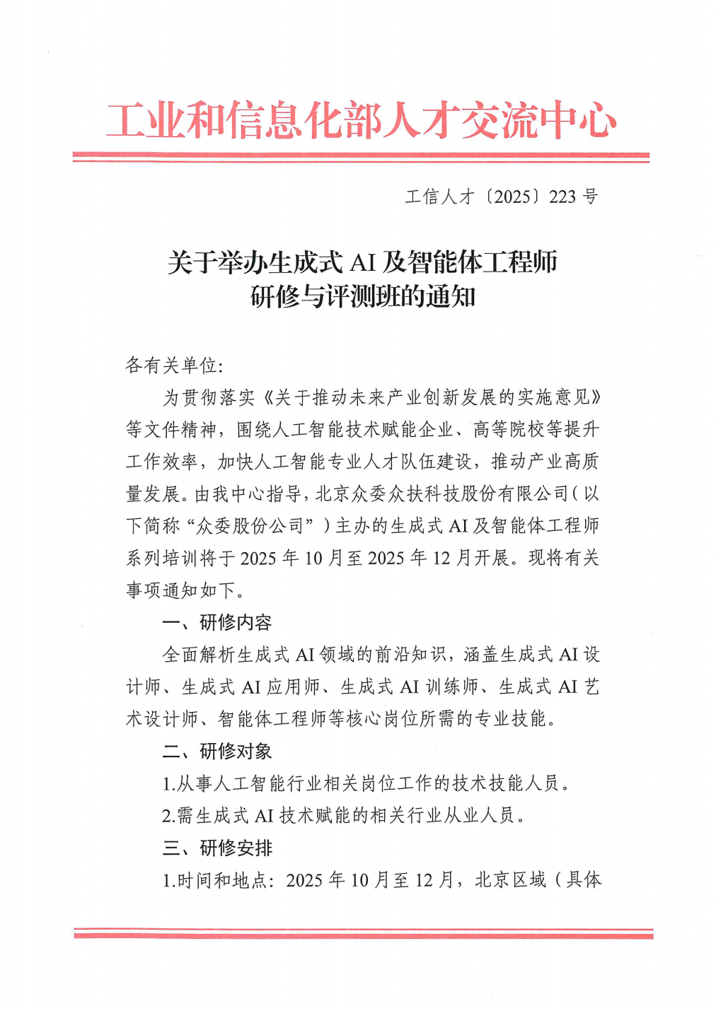 关于举办生成式AI及智能体工程师研修与评测班的通知