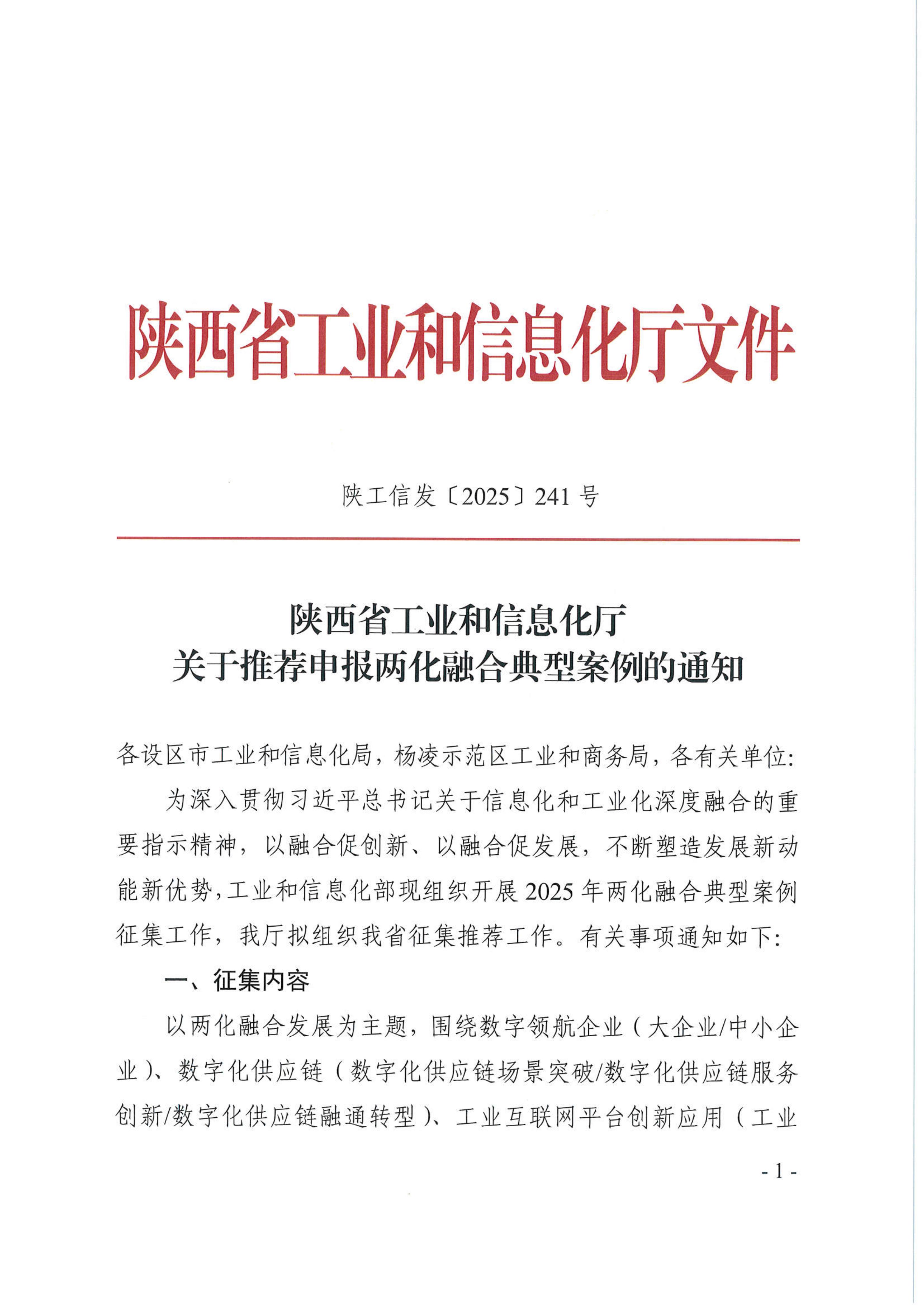 陕西省工业和信息化厅关于推荐申报两化融合典型案例的通知