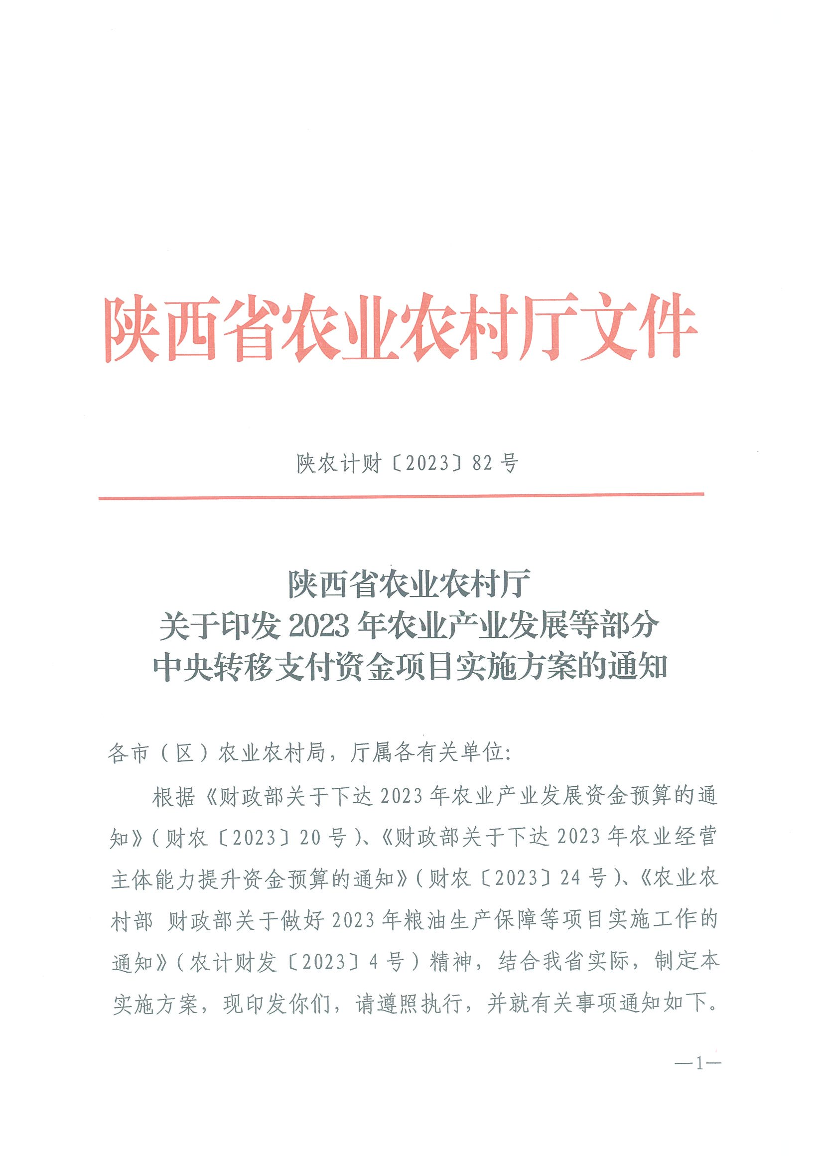 陕西省农业农村厅关于印发2023年农业产业发展等部分中央转移支付资金项目实施方案的通知