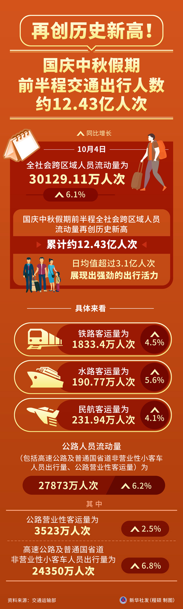 一图读懂 | 再创历史新高!国庆中秋假期前半程交通出行人数约12.43亿人次