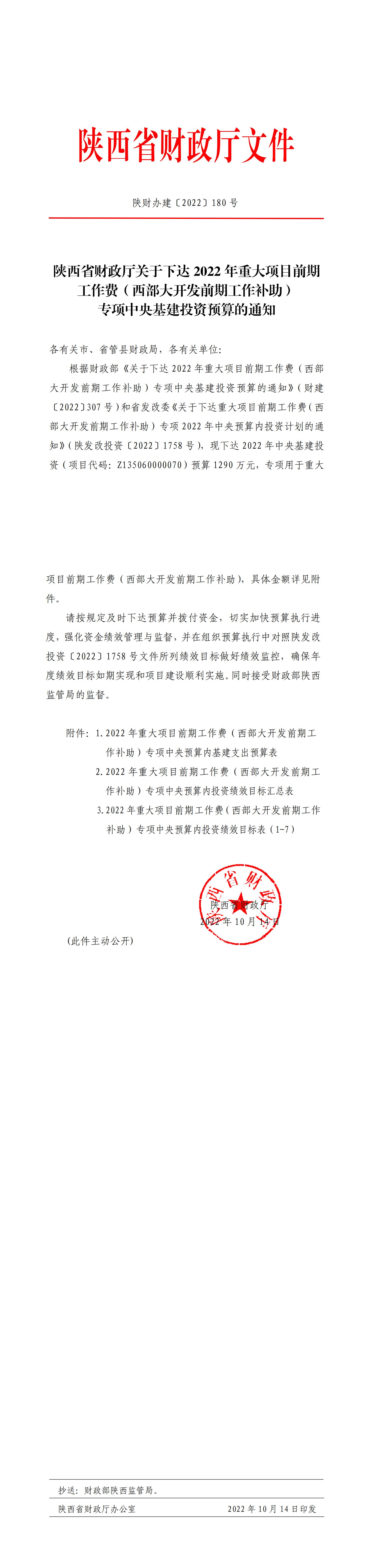 陕西省财政厅关于下达2022年重大项目前期工作费(西部大开发前期工作补助)专项中央基建投资预算的通知