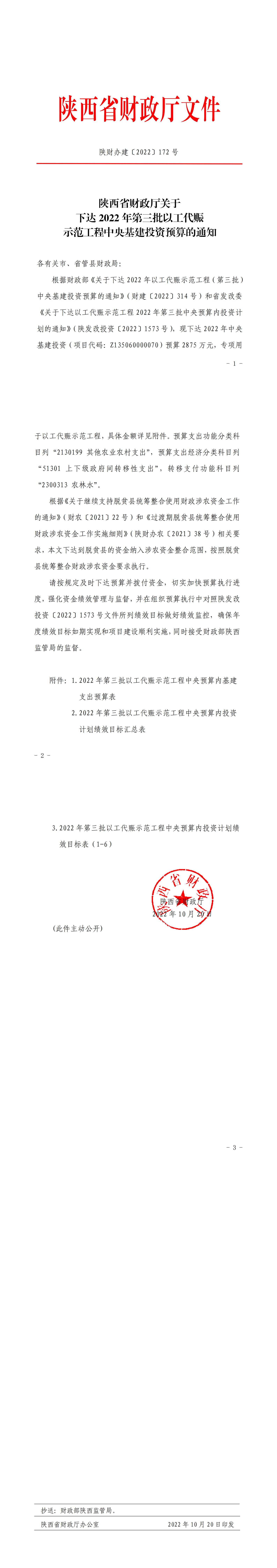 陕西省财政厅关于下达2022年第三批以工代赈示范工程中央基建投资预算的通知