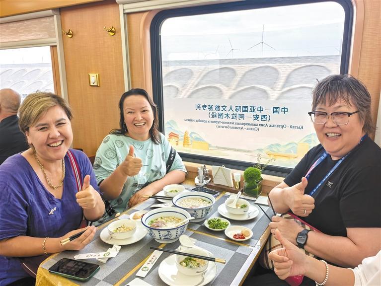 6月6日,乘坐中国—中亚国际人文旅游专列前往西安的哈萨克斯坦乘客在品尝羊肉泡馍后,竖起了大拇指。