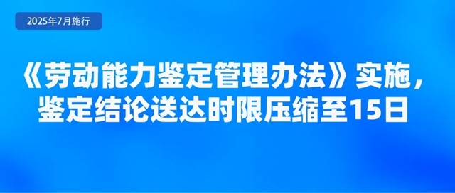 人力资源社会保障部、国家卫生健康委联合印发的《劳动能力鉴定管理办法》,自2025年7月1日起施行。《办法》明确,工伤职工和因病或非因工致残申请领取病残津贴人员申请劳动能力鉴定适用本办法。劳动能力鉴定分为初次鉴定和再次鉴定,对初次鉴定不服可以申请再次鉴定,再次鉴定为最终结论。《办法》强调,要加强便民服务,减少不必要材料,信息共享能够获取的申请材料不得要求申请人重复提交;压缩鉴定时限,将结论送达时限从20日压缩至15日;加强无障碍环境建设,完善无障碍服务设施设备。