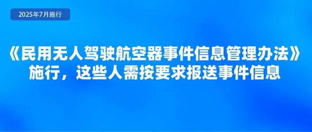 为规范民用无人驾驶航空器事件信息的管理,准确掌握有关无人驾驶航空器安全运行信息,及时发现安全隐患,控制运行风险,日前,民航局印发《民用无人驾驶航空器事件信息管理办法》,自7月1日起施行。《办法》要求,特定类和审定类合格证持有人、拥有中型和大型无人驾驶航空器50架(含)以上的开放类合格证持有人、拥有大型无人驾驶航空器10架(含)以上的开放类合格证持有人应当制定事件信息管理程序,指定满足条件的人员负责事件信息管理,并按要求报送事件信息。事发相关单位和人员应当按照规定如实报告事件信息,不得瞒报、谎报或者迟报。