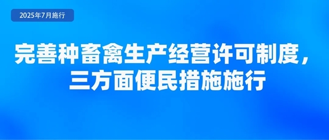农业农村部公布了《种畜禽生产经营许可管理办法》,于2025年7月1日起实施。《办法》规定了三方面便民措施。一是统一平台办理。种畜禽生产经营许可证的申请、受理、审核、核发,统一在中国种业大数据平台办理,平台提供查询、核验等功能,并与全国一体化在线政务服务平台对接。二是统一有效期。《办法》将有效期统一确定为5年,并明确已取得的种畜禽生产经营许可证有效期不变,到期后按照新规定办理。三是简化变更手续。对变更生产经营者名称、法定代表人(负责人)以及从事父母代种畜禽(含品种和配套系)和商品代仔畜、雏禽生产经营,需要变更其生产经营的畜禽品种的,向原发证机关提交变更申请表及证明材料,符合条件的,原发证机关在十五个工作日内即予以变更。
