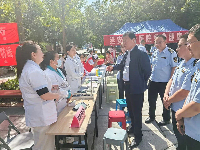 义诊服务区内,来自宝塔区高新医院与宝塔区妇幼保健院的医护人员为市民提供了血压测量、血糖检测及视力检查等免费健康服务,并根据检测结果给予专业的健康指导。