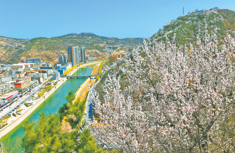 春日里的志丹县城,漫山的山桃花、杏花次第开放,翠绿的松柏点缀其间。一条宛如玉带的河水绕城而过,河两岸的迎春花竞相绽放,并有垂柳依依,随风摇曳,各种水鸟在河面上翔集嬉戏。头顶湛蓝的天空,万里无云,空气中飘弥着淡淡的花香。人们或漫步于河堤垂柳与春花之间,或拾级而上穿梭于杏林之下,好不惬意。登高远眺,整个县城犹如一幅“水韵志丹”的水彩画,美不胜收。( 记者 祁小军 摄)