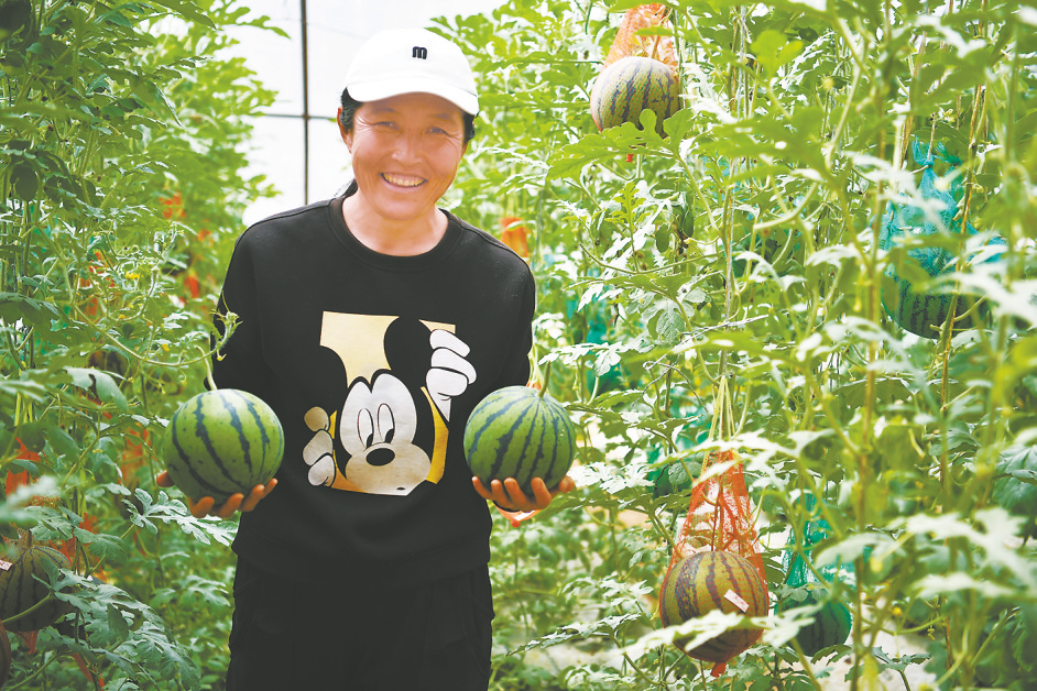 ③:延安市宝塔区枣园街道上砭沟村村民周改玲在大棚内采摘西瓜