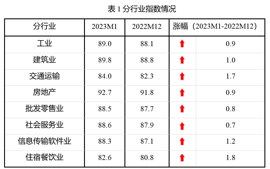 8个分行业指数全面回升。如下表所示,随着疫情形势好转,1月份8个行业指数均上升,特别是交通运输邮政仓储、住宿餐饮等接触性聚集性行业上升明显,分别比上月上升1.7和1.8点,升幅最大;工业、交通运输邮政仓储业、批发零售业和社会服务业指数止跌回升;建筑业指数由平转升;房地产、信息传输计算机服务软件业和住宿餐饮业指数连续两个月上升。同时也要看到,8个行业指数均处于景气临界值100以下,说明行业恢复状况仍较弱。