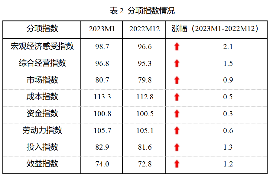 8个分项指数全面回升。如下表所示,1月份8个分项指数全部比上月上升,其中,宏观经济感受指数、成本指数和投入指数连续两个月上升,综合经营指数、市场指数、劳动力指数、资金指数和效益指数止跌回升。从景气状况看,资金指数和劳动力指数处于景气临界值100以上,宏观经济感受指数、综合经营指数、市场指数、投入指数和效益指数均处于景气临界值100以下,成本指数仍处于不景气区间,效益指数一直处于最低位。