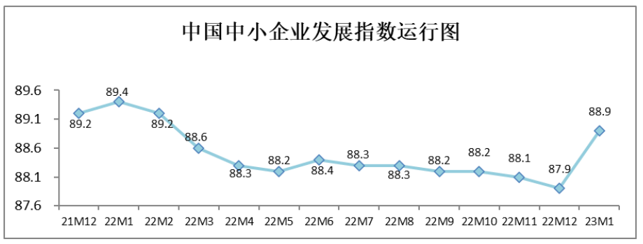 元旦前后新冠疫情感染人数迅速达峰,此后逐步回落,疫情很快趋于平稳,企业生产和社会生活秩序逐步恢复。1月份,中小企业发展指数(SMEDI)为88.9,比上月回升1个点,扭转了去年初以来持续震荡下行态势,虽然仍在景气临界值100以下,但上升幅度达到近两年来最高。其中,分项指数和分行业指数均全面回升。8个行业中,交通运输邮政仓储业、信息传输计算机服务软件业和住宿餐饮业上升明显;分项指数中,宏观经济感受指数、综合经营指数和投入指数上升较为明显。