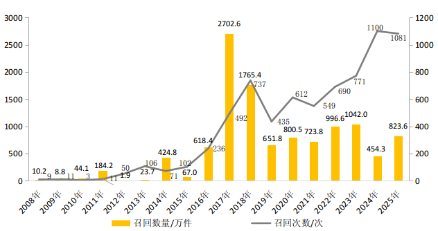 2025年,市场监管总局坚持以人民为中心的发展思想,统筹发展和安全,持续强化缺陷产品召回监管。聚焦新能源汽车、重点消费品等领域,严守安全底线,保护消费者人身财产和社会公共安全,助力产业高质量发展。根据《缺陷汽车产品召回管理条例》《机动车排放召回管理规定》和《消费品召回管理暂行规定》等,现将2025年全国汽车和消费品召回有关情况通告如下:
